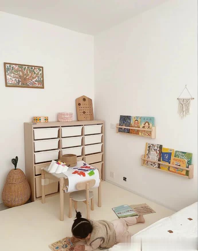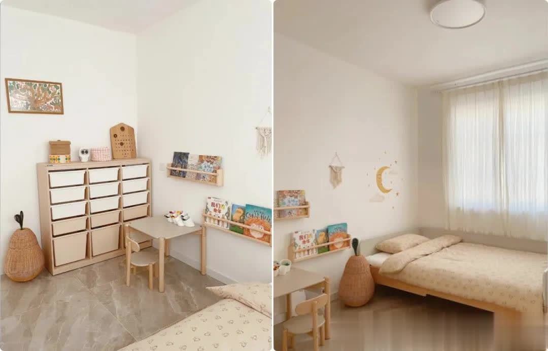 因为孩子太小,刚分房,所以儿童房基本是最简单做法,所有家具都买的库存实木家具,没有做衣柜,因为孩子小,衣服都和大人衣柜一块收纳,最大化减少污染量。