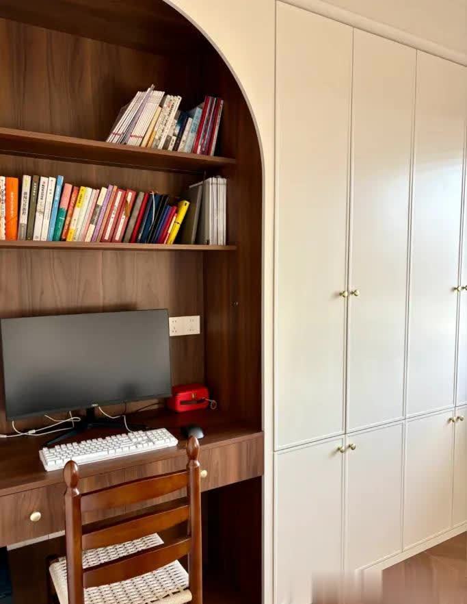 自己入住连个书房都没有,装修给亲戚留个客房?这种做法完全是本末倒置。所以装修之初坚决不留客房,次卧一面墙的衣柜,做了一个办公书桌,同时满足衣帽间收纳以及平时的办公。