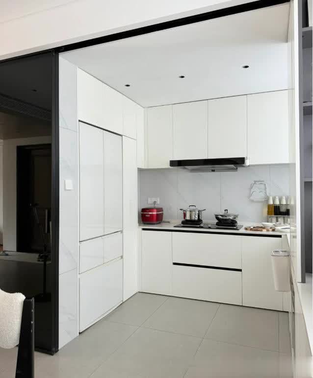 空间小入住人多不是更应该多做收纳吗?所以装修以自己生活习惯为主,不仅满做了吊柜,而且冰箱上头也做了吊柜,可以放一些平时不常用的物品,现在入住一年,厨房永远都是干干净净,绝对不后悔多做收纳。