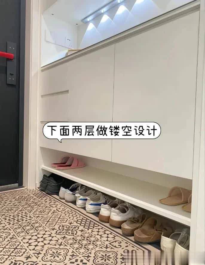 因为受够了鞋子乱放,也受够了一层收纳不够还得乱放一地鞋子,所以定制的时候专门交代一定做成两层镂空,再也不要乱放鞋子了。入住一年多再也没有出现过鞋子乱放的问题。这才是最实用的细节设计,做了绝对不会后悔。