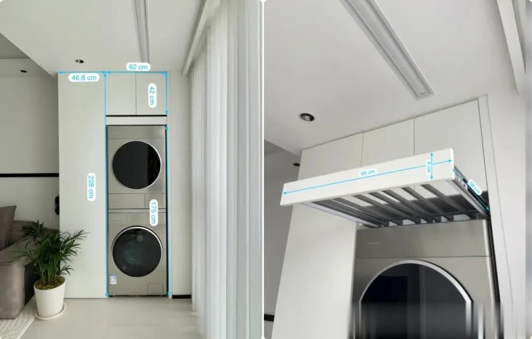 阳台贴墙砖不存在的,太丑太出租风了;做哑口套费钱又丑陋;把这些不做的钱加一起完全都满足洗烘机的做法了,而且还加了一个抽拉的晾衣架,平时小件不宜烘干的可以满足晾晒,而且头顶还备有隐形晾衣架,满足平时大量晾衣晾被子。
